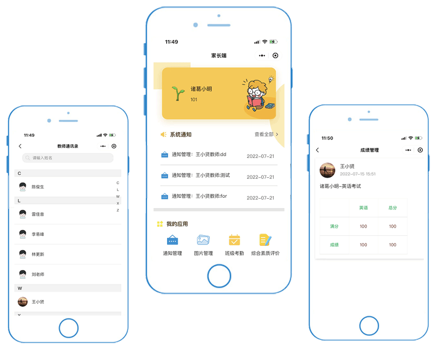 實現(xiàn)數(shù)字化辦公,對外向?qū)W生家長提供各種服務(wù),如:消息通知、請假管理,校園活動,學生動態(tài),教師通訊錄,學生定位等各種服務(wù)。對內(nèi)向教師提供各類服務(wù),如:班級管理,考勤管理,請假管理,活動管理,課堂點名,家長會管理,教師課程等等各種服務(wù)